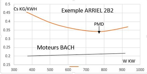 The example above shows the Cs of a recent ARRIEL, which consumes 0.34 Kg/KWH of fuel at PMD, but this figure increases to 0.4 at 500 KW which is the power limit on an AS350. On the contrary, the BACH engine goes from 0.22 at PMD to 0.2 at PMC.