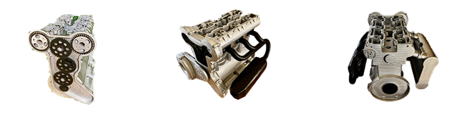 Below are the parameters of a BACH cylinder capable of continuously giving 67 KW at 7500 rpm with a mass of 21.6 Kg, as well as a model of the BACH 3-cylinder engine block, seen on the distribution side. The specific consumption is 0.2 Kg/Kwh. The specific mass is 0.36 Kg/Kw including all elements attached directly to the engine block. For short periods we can obtain 76 KW at 8500 rpm, without significantly reducing the lifespan.